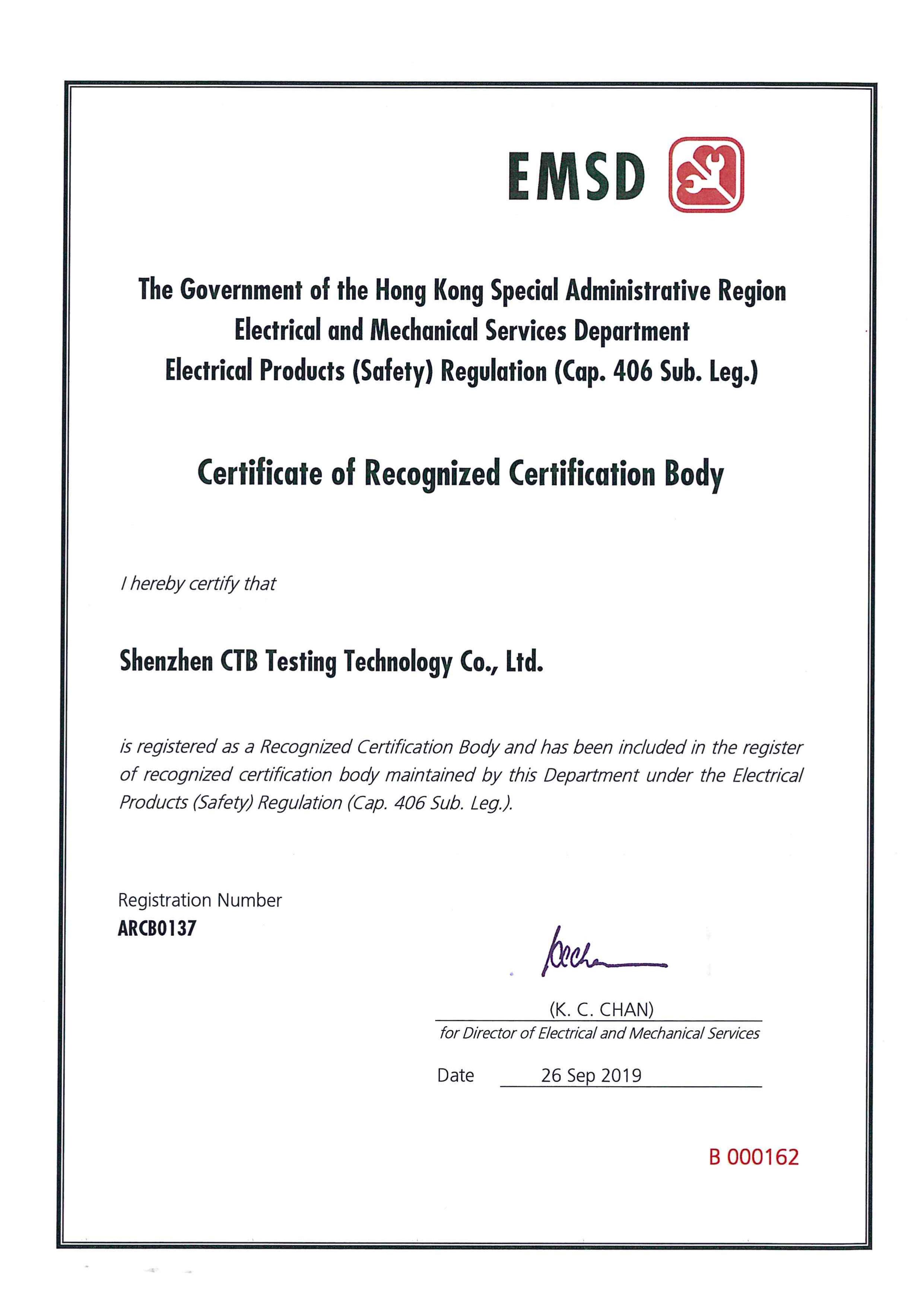 香港機(jī)電署授權(quán)證書